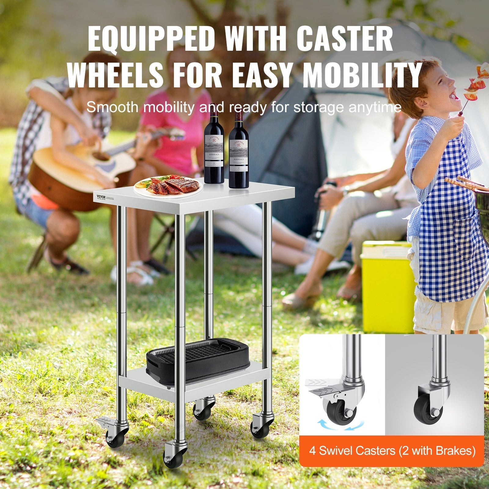 VEVOR Stainless Steel Work Table 24 X 18 X 38 Inch, With 4 Wheels, 3 Adjustable Height Levels, Heavy Duty Food Prep Worktable For Commercial Kitchen Restaurant, Silver