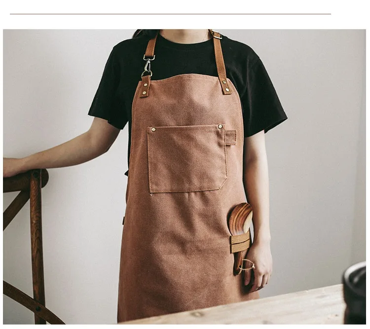 CROSS BACK APRON:The apron is equipped with adjustable belts, which are cross back apron , which can better distribute the pressure and prevent neck pain. The strap joint made of the first layer of cowhide shows high quality,Won't break.
