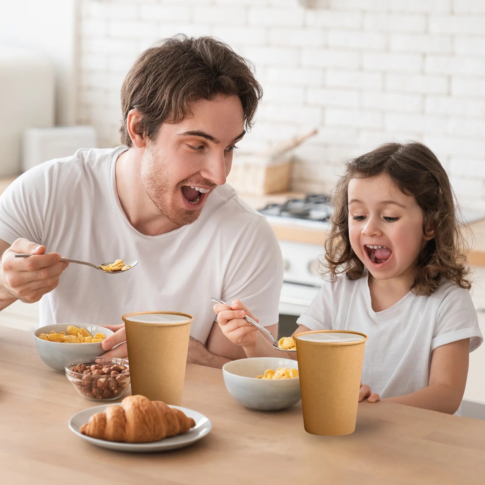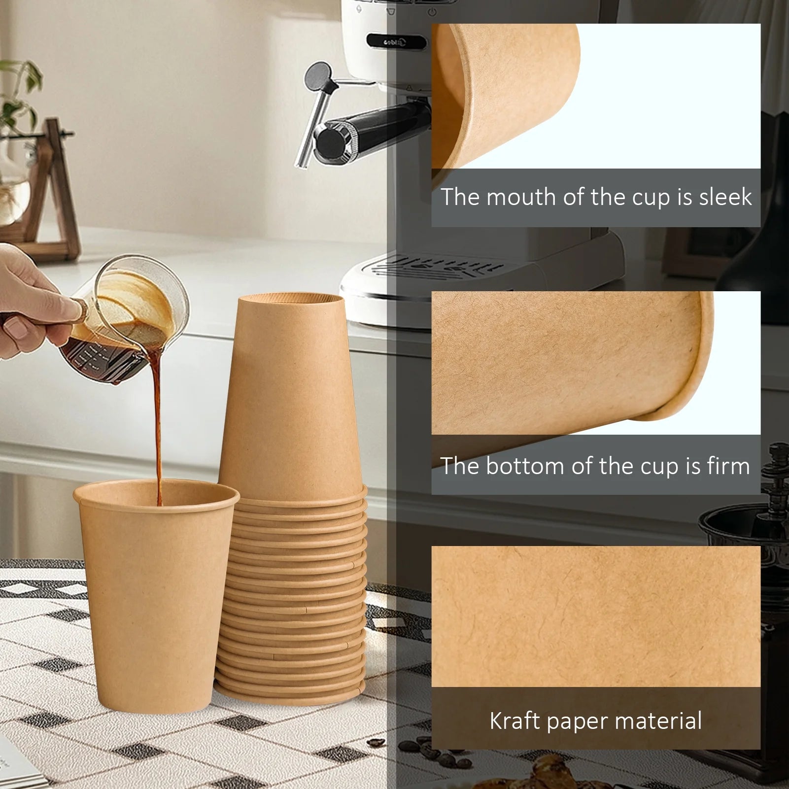 Lamosi Disposable Paper Cups, To Go Hot Cups, 12 oz, Kraft,100 Count The sturdy kraft cup is made of thickened high quality paper and the rolled cup rim is firm and strong.that stands up the hot temperature on the go coffee. Our paper cups are made extra thick and sturdy to ensure that they are durable for everyday use.Great for hot or cold beverages, while being sturdy enough to not fall apart.Disposable paper cups are made from healthy food-grade materials and are BPA-free, you can feel good about enjoying this hot and cold beverage cup with your family and friends.It has great Addition to All Events. 12oz paper cups work well to serve coffee at theater, DIY, gathering, wedding, office, church or classroom. Disposable coffee cups 12 oz are soft to the touch and they won't burn your hands. The paper cups are very eye-catching, highlight your personality with special design.We still look forward to a hot cup of coffee every morning to bring you good luck, the sun is with you and we are with you!