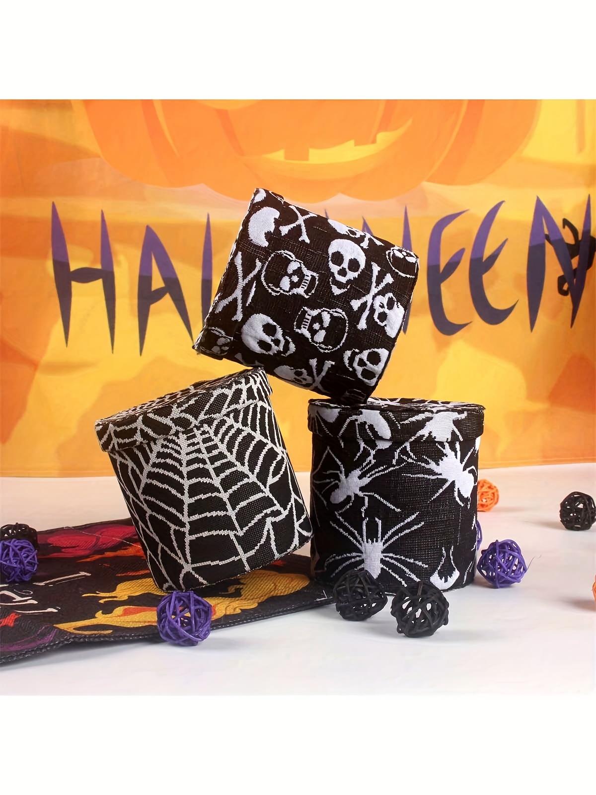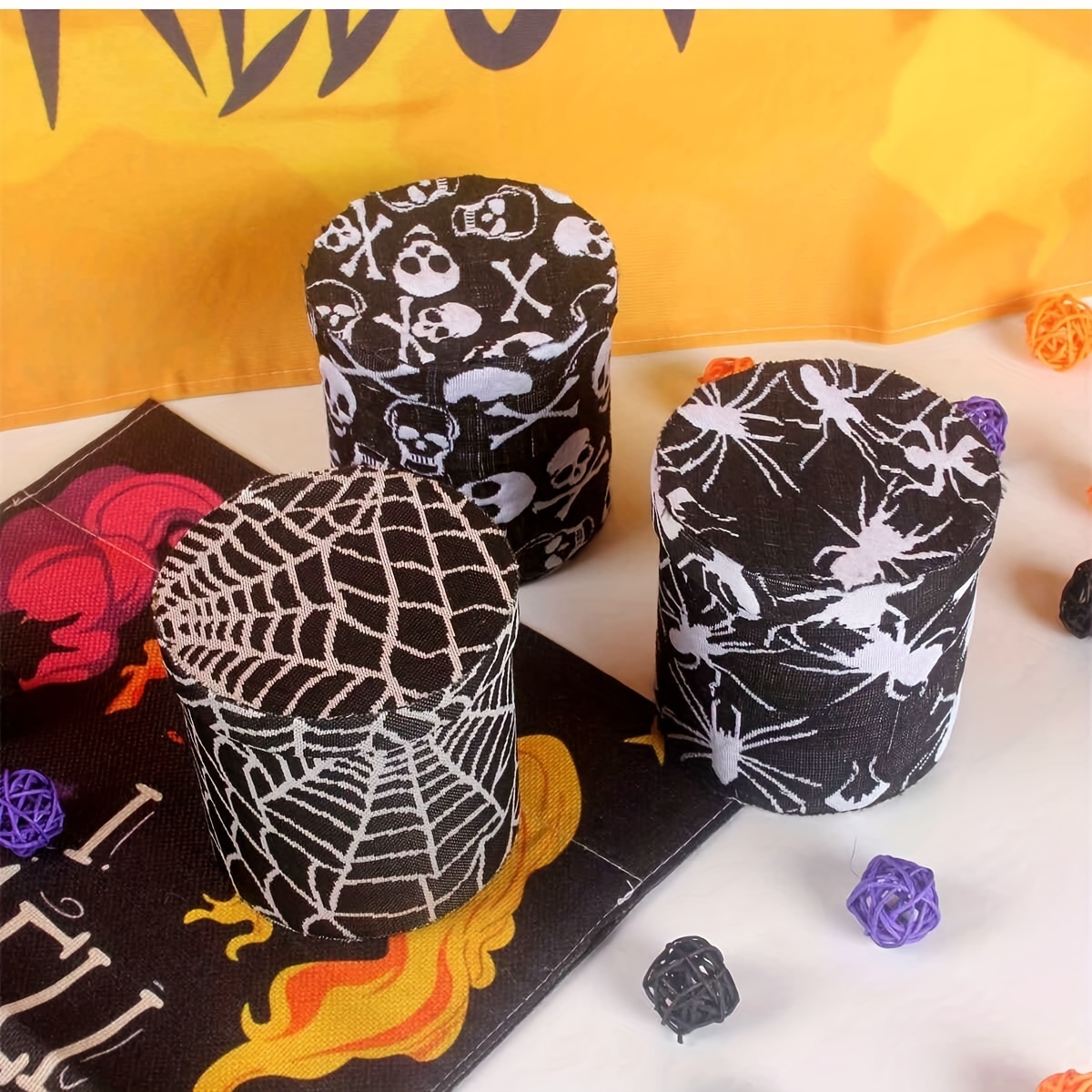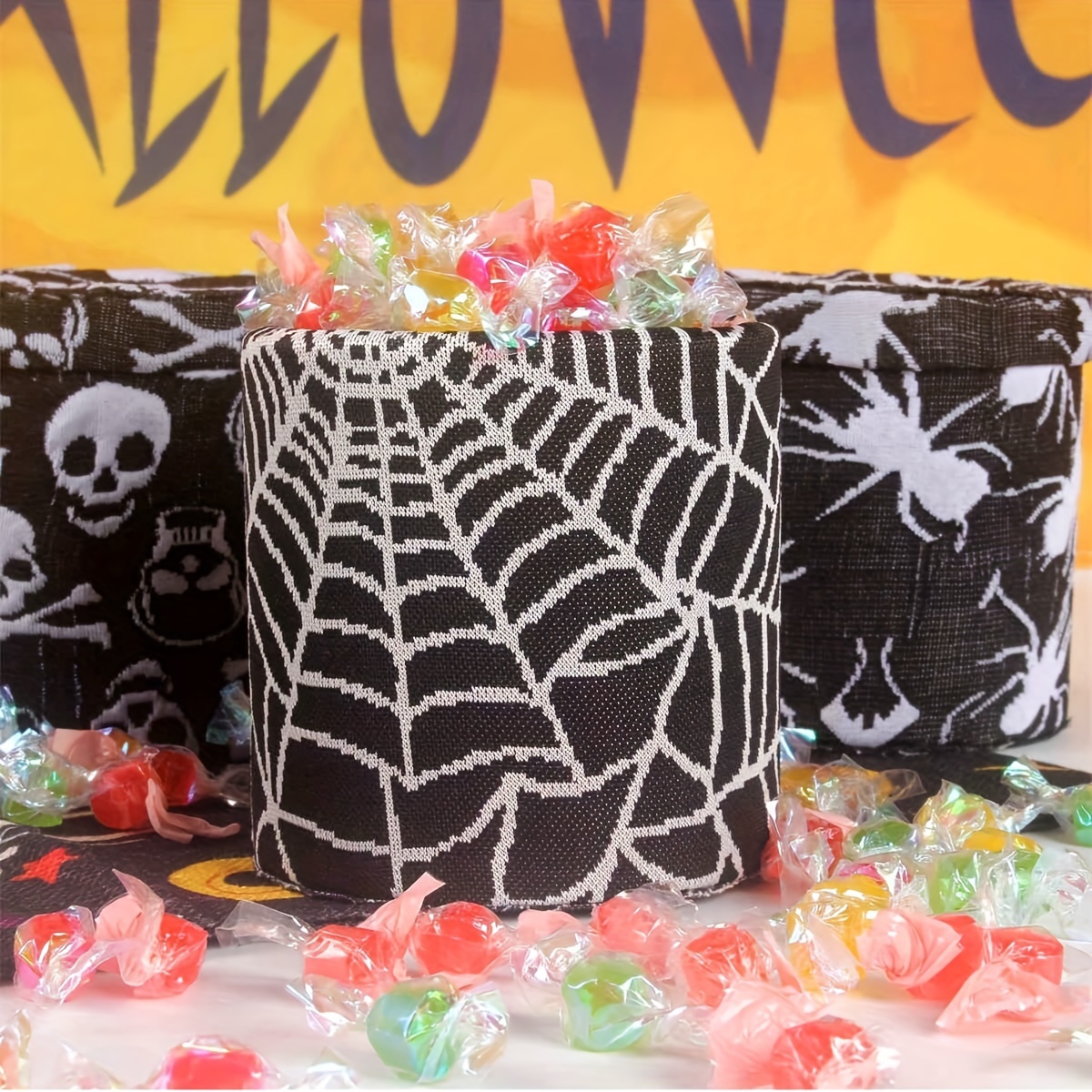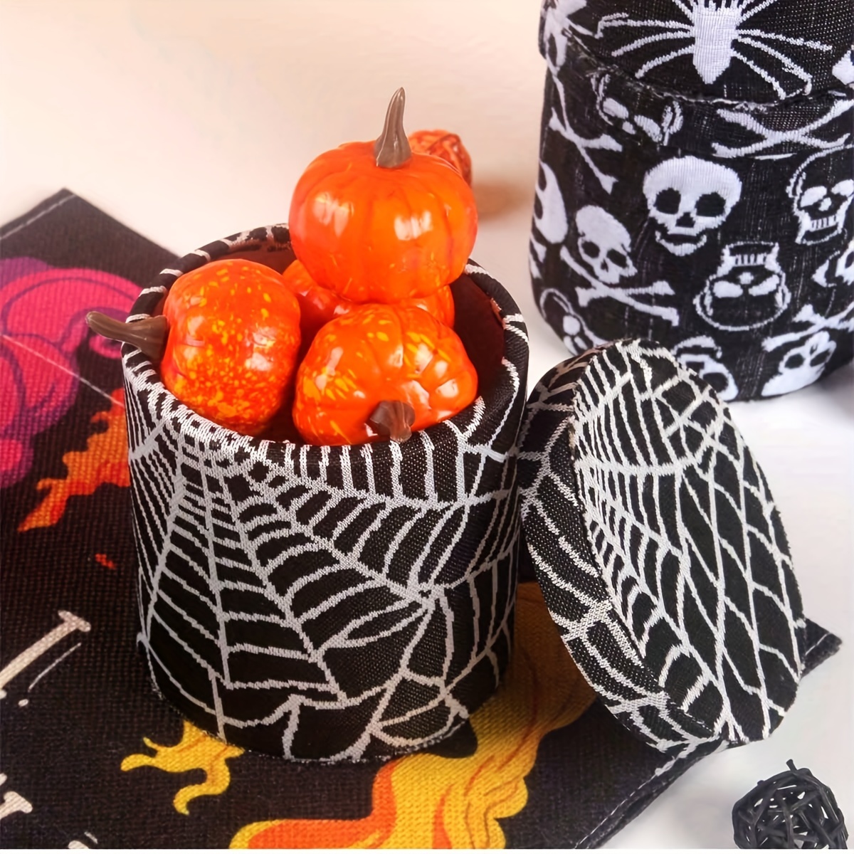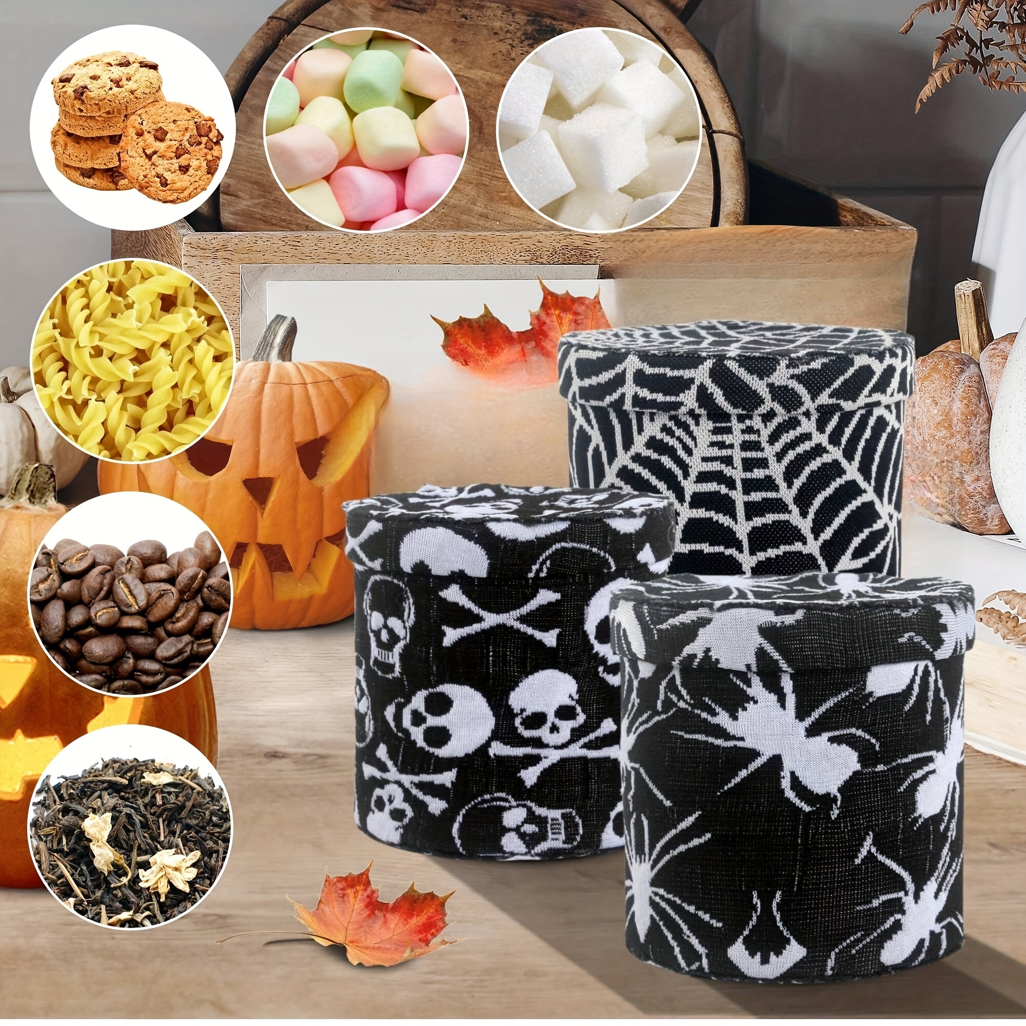 A spooky jar for Halloween treats, a festive jar covered in cloth for Halloween, perfect for decorating your kitchen counter, featuring spider webs and skeleton embroidery, ideal for storing flour, sugar, coffee beans, and tea