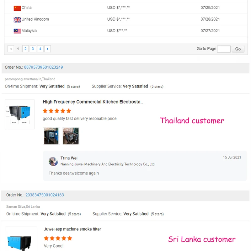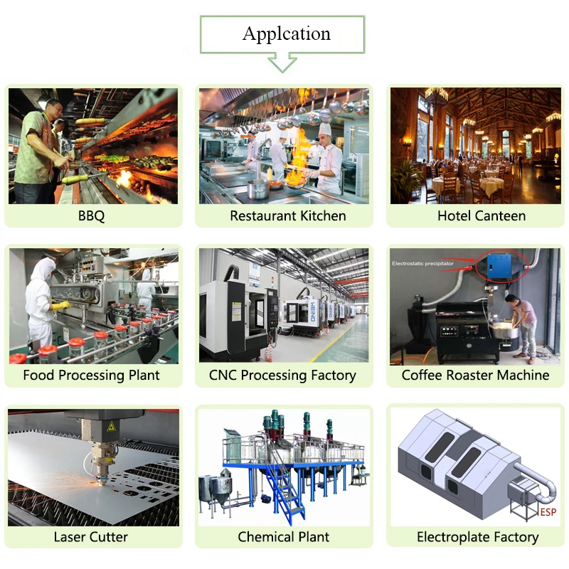 We are professionally specialized in manufacturing and exporting many kinds of electrostatic precipitator (ESP), air blowers and exhaust hoods for kitchen, restaurant, hotel, CBD, factory, industrial cutting machine plant, coffee bean roasting machine plant, CNC processing factory and so on.