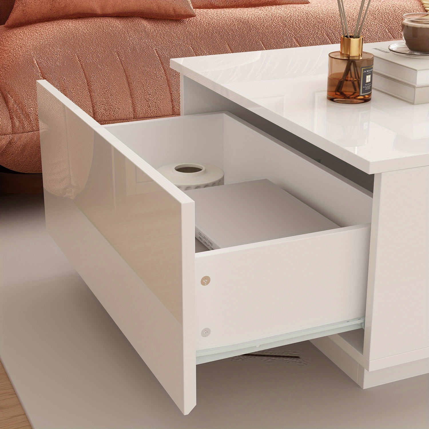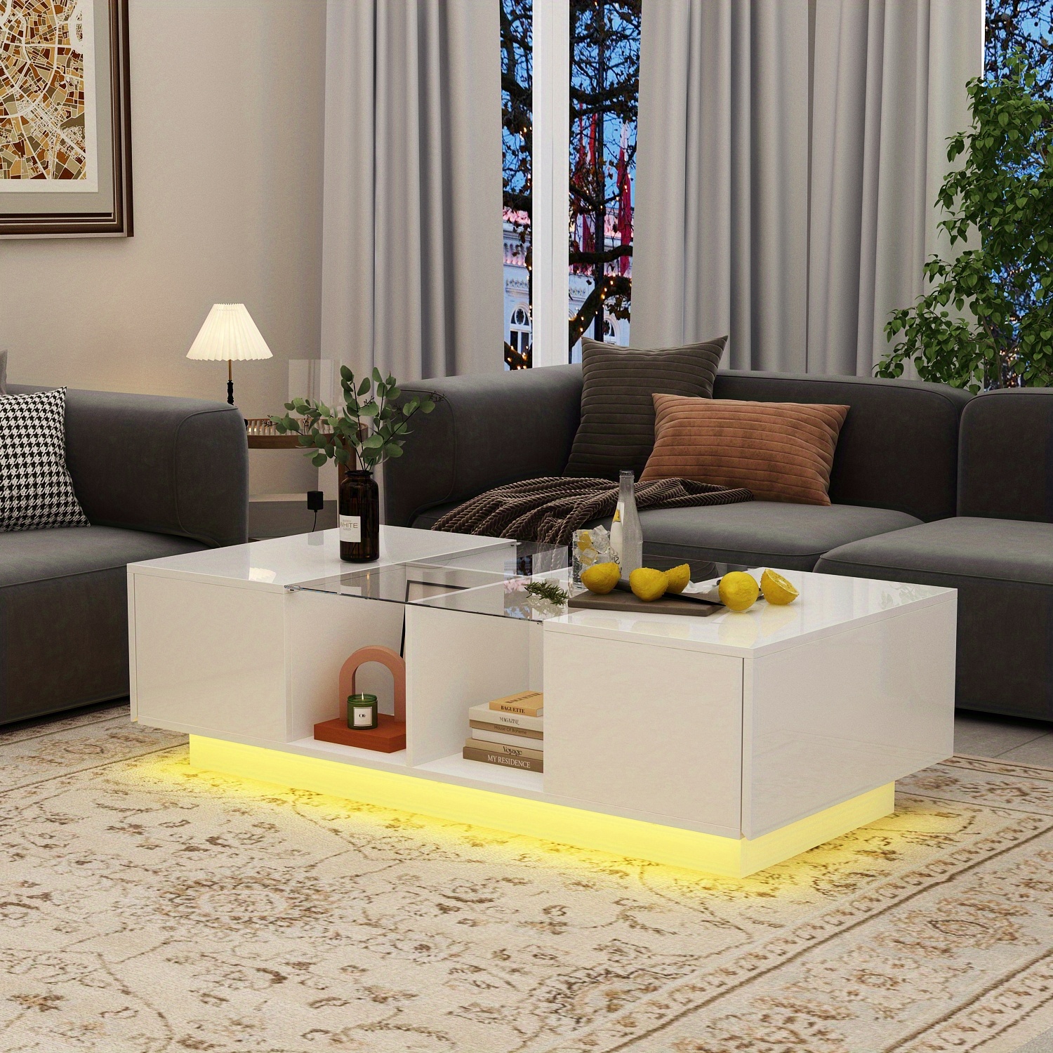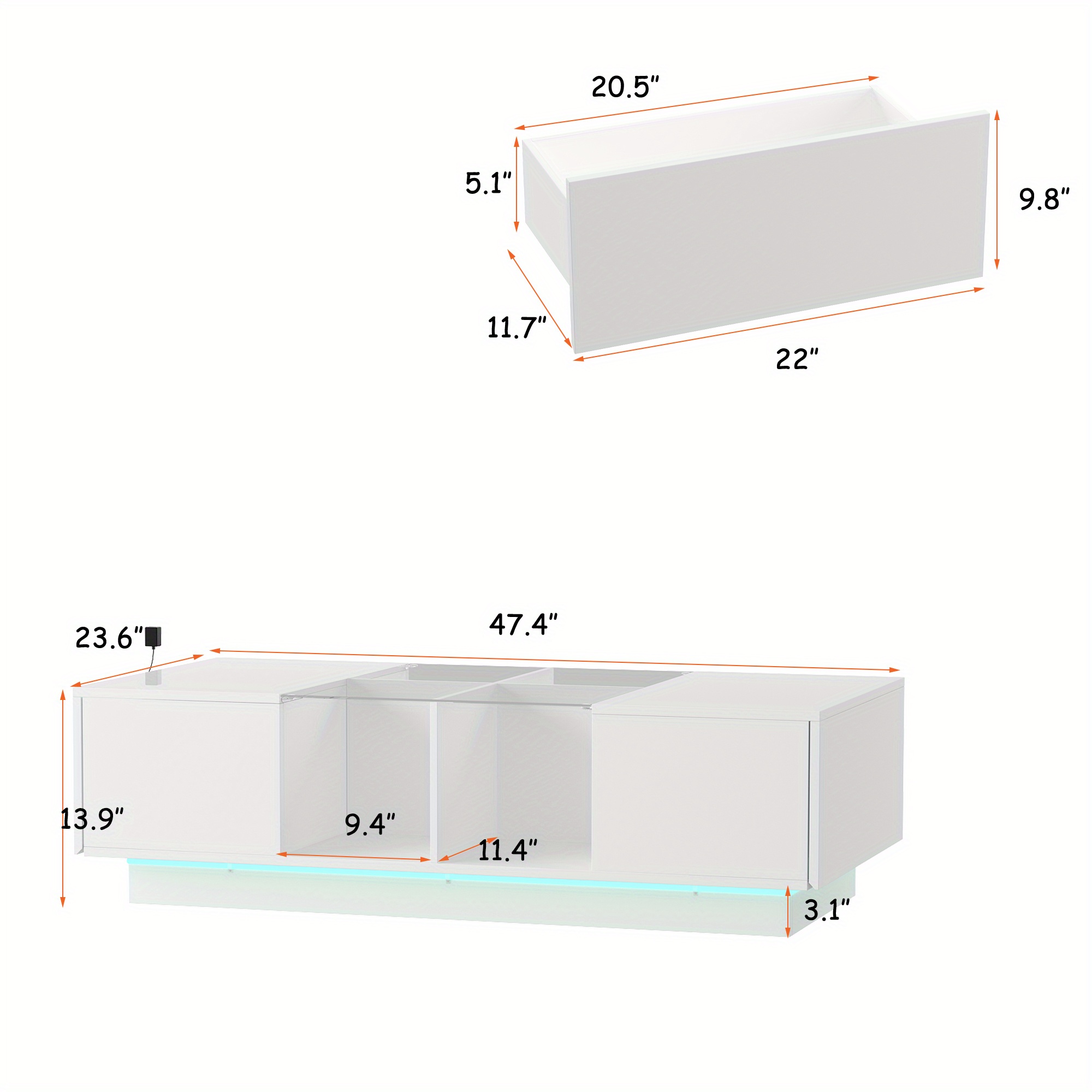 Illuminate your living space with the colorful LED lights, adding a touch of relaxation and excitement to your life. The sleek design of the coffee table with open storage cabinets on both sides provides ample space for organizing smaller items, enhancing your home storage. Crafted from tempered glass and MDF, this high-gloss LED coffee table is not only stylish but also durable, making it a sophisticated addition to your office or home decor. With its 2-in-1 design, this table serves as both a functional piece of furniture and a source of illumination, perfect for various settings such as your living room, office, or bedroom. Measuring 47.4*23.6*13.9 inches, this easy-to-assemble table comes with all necessary hardware and instructions for quick installation.