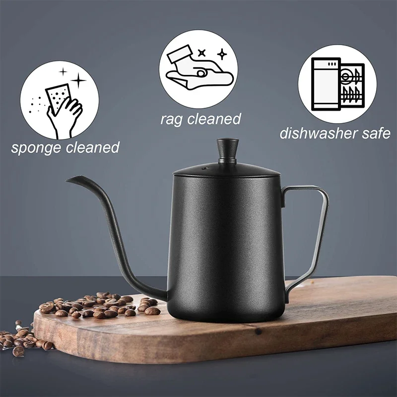【Food grade 304 stainless steel】The pour over coffee kettle is made of food grade 304 stainless steel, the Gooseneck kettle is anti-rust,anti-corrosion and totally BPA free.You can wash it with warm water or put it in dishwasher. The hanging ear handle can prevent you from getting hurt by hot water.