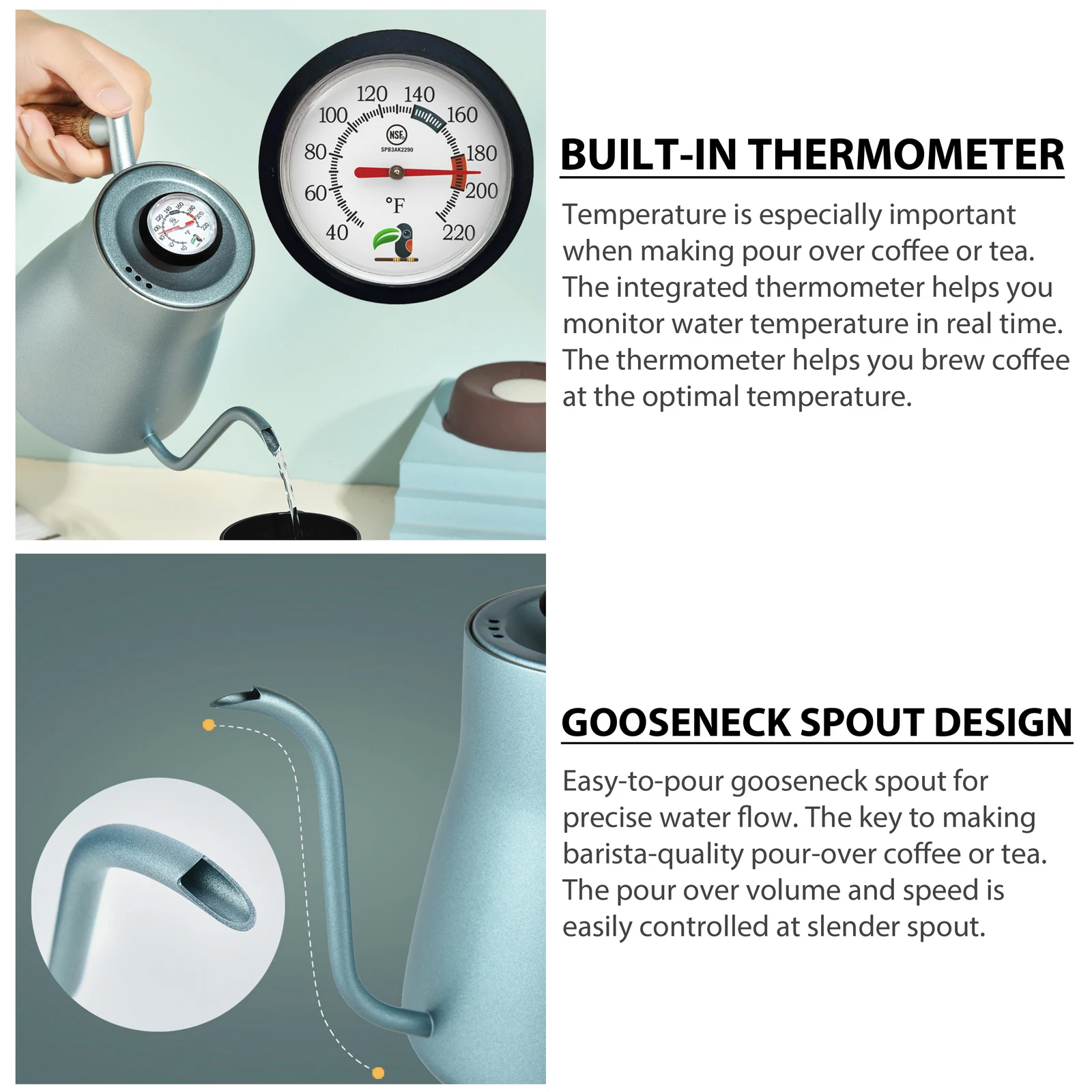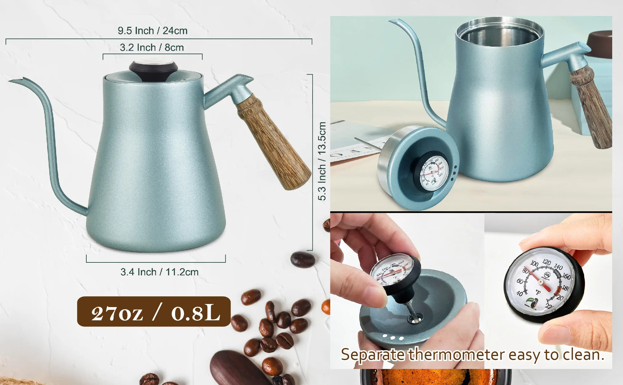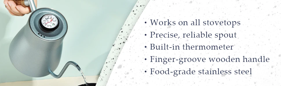Use our gooseneck kettle to make delicious pour over coffee in your home like a Pro. The body is food-grade stainless steel, so it’s easy to keep clean and should last forever. The wooden handle is ergonomically designed, and the long gooseneck spout provides perfect pouring precision. They allow you to control the rate of water flow, and the temperature. It’s equipped with a thermometer, so you can precise water temperature for brewing. Make a perfect cup of coffee every time with our easy to read coffee thermometer! The base is a heavier duty stainless steel, which conducts heat optimally and works on any stovetop.