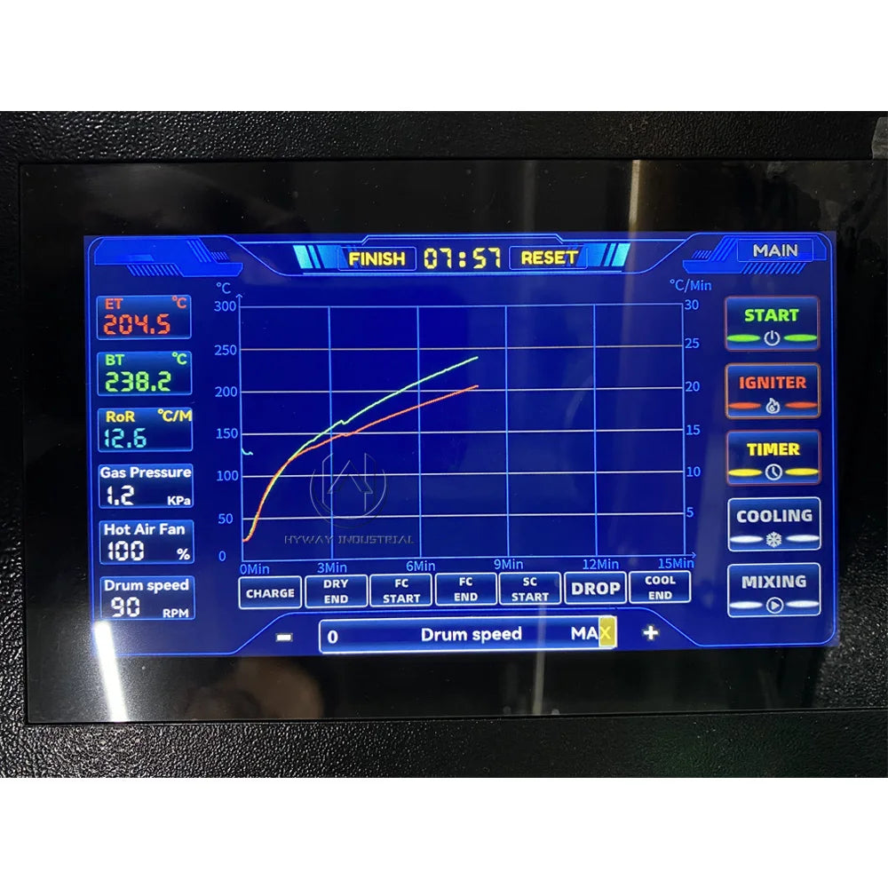 - Roater Drum:Using the international 304 standard food grade stainless steel, to make sure the pure taste of roasted coffee beans is not affected by other off-flavors. With the independent design of the stirring blades,the coffee beans will do reciprocating moving in drum, make the baking more uniform, the skin more easily to drop off.