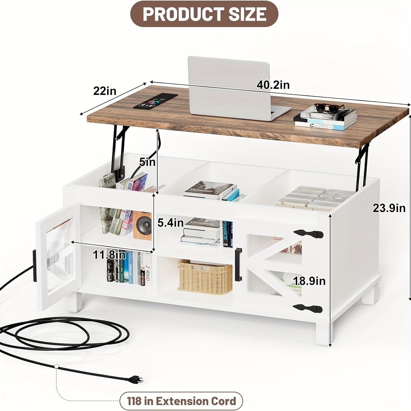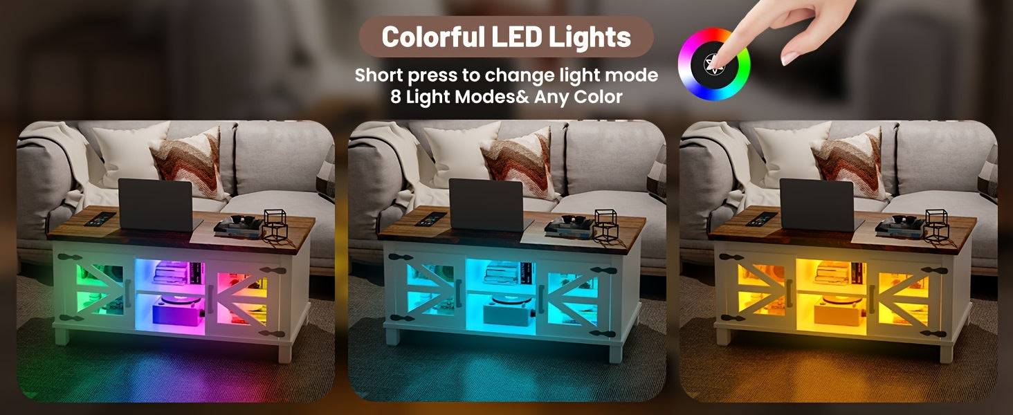 Lift Top Coffee Table with RGB Lights, Farmhouse Coffee Table with Charging Station, Dining Table with Large Hidden Storage Shelf for Living Room, 22" (55.8cm) D x 40.1"(101.85cm) W x 19" (48.26cm) H