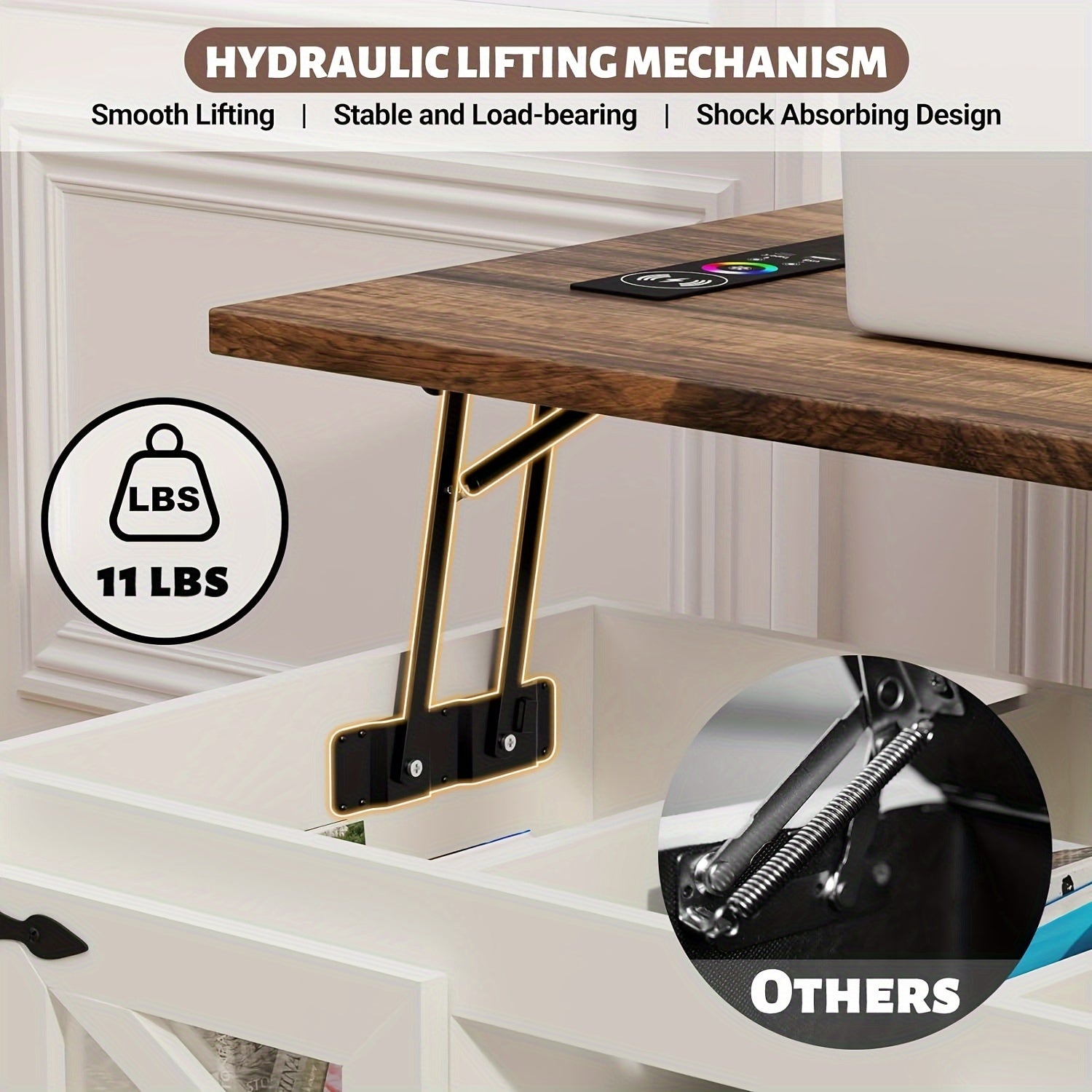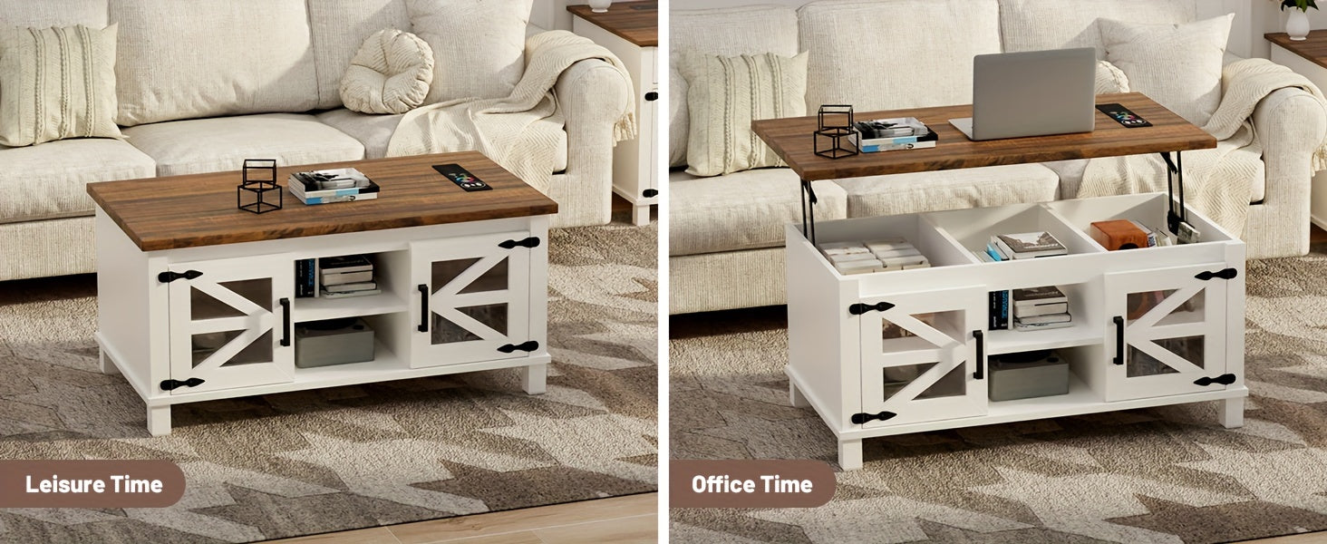 The coffee table has a versatile lifting design, allowing the tabletop to be raised by 5 inches. It can serve as both a coffee table and a computer desk, catering to various needs like dining, working, and gaming.