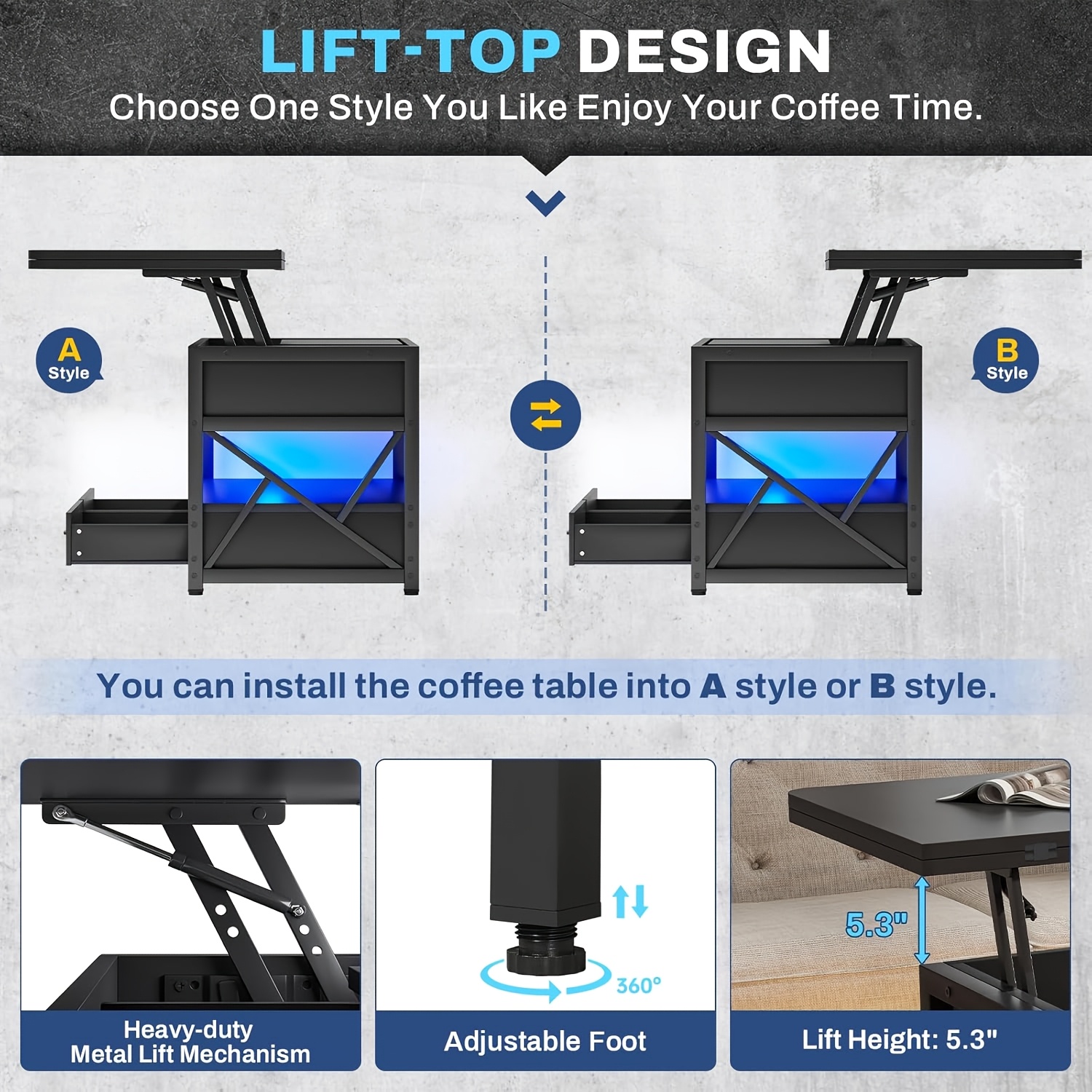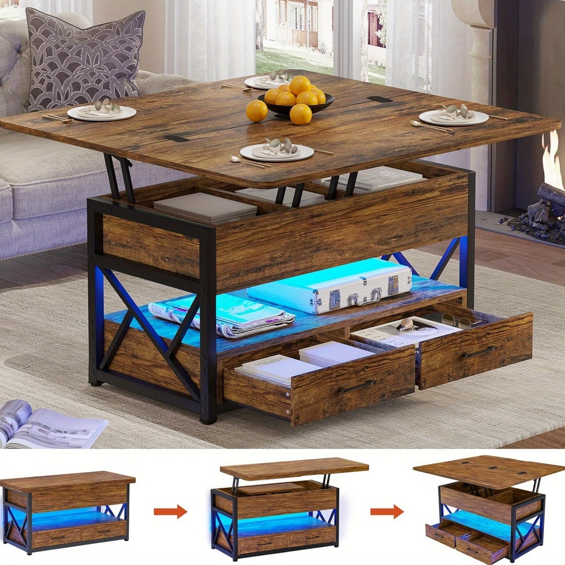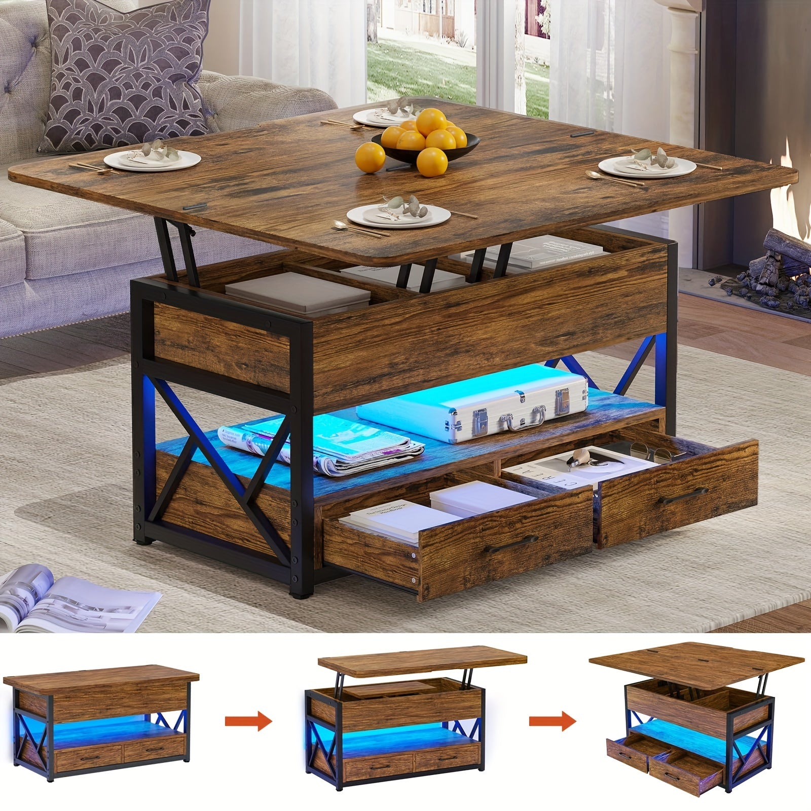 The lift top coffee table with 4 lifting methods also has partitioned hidden storage compartment, an open storage shelf, 2 drawers and LED light. A small coffee table for living room can be used when eating, working, studying and playing games, quietly and easily lift the table top to facilitate small room to make full use of the space.
