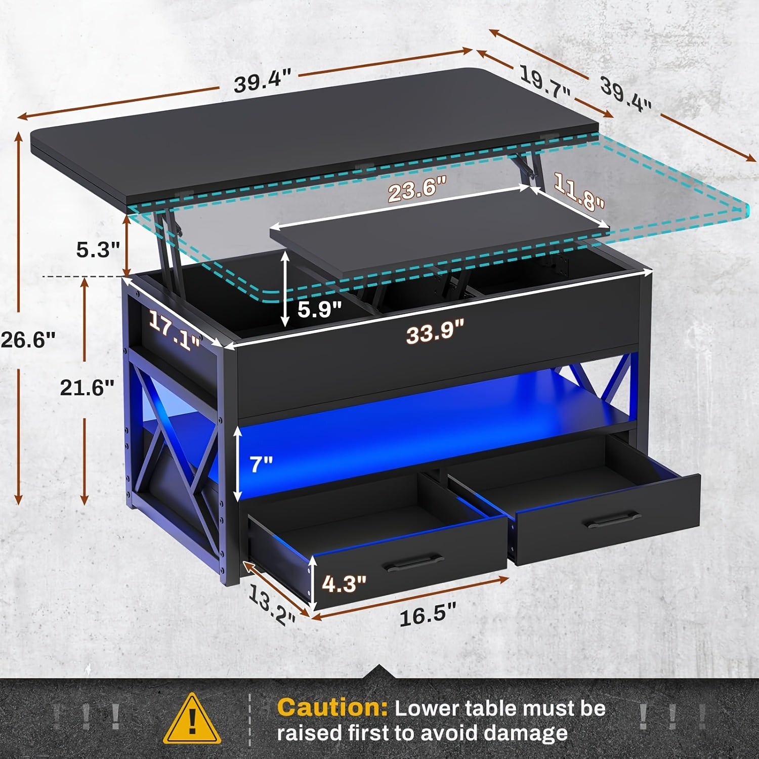 Equipped with advanced LED lighting, this coffee table enhances your workspace ambiance with over 60,000 colors to choose from. The lighting can be synced with music, controlled via a remote or an app, and even set to a timing function for automatic on/off, creating the perfect atmosphere.