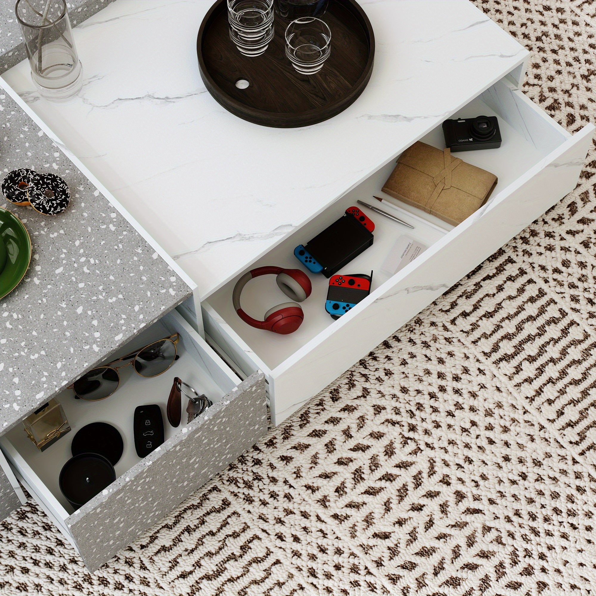 Storage Function - The Coffee Table Possesses Wide Tabeltop And 4 Storage Drawers That Offers You Ample Storage To Put Your Things Like Snacks, Books And Decorations.