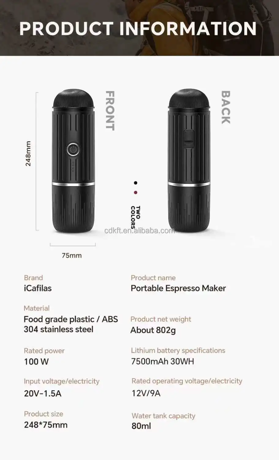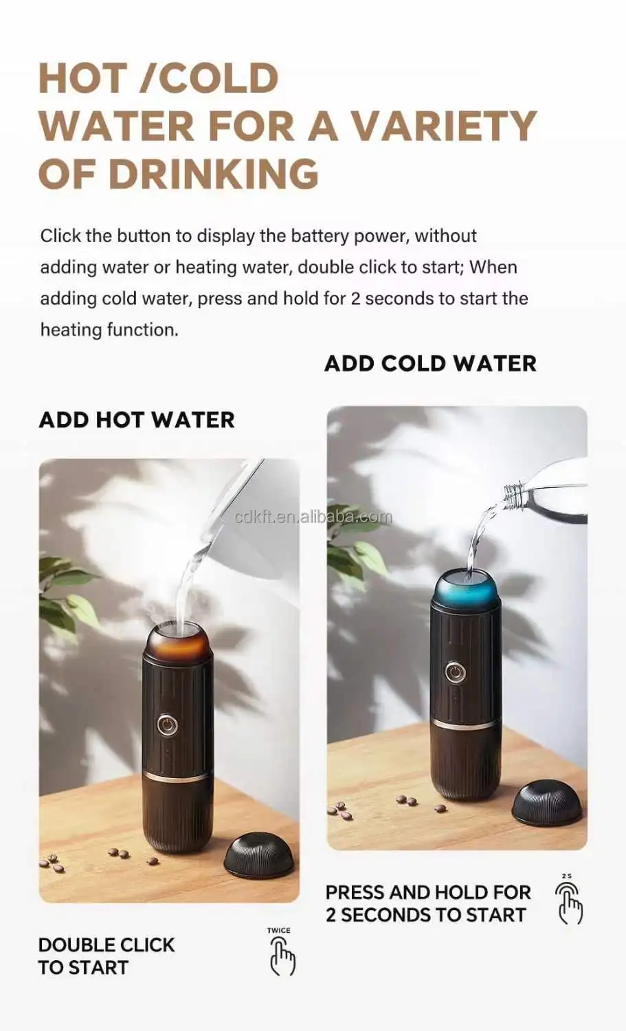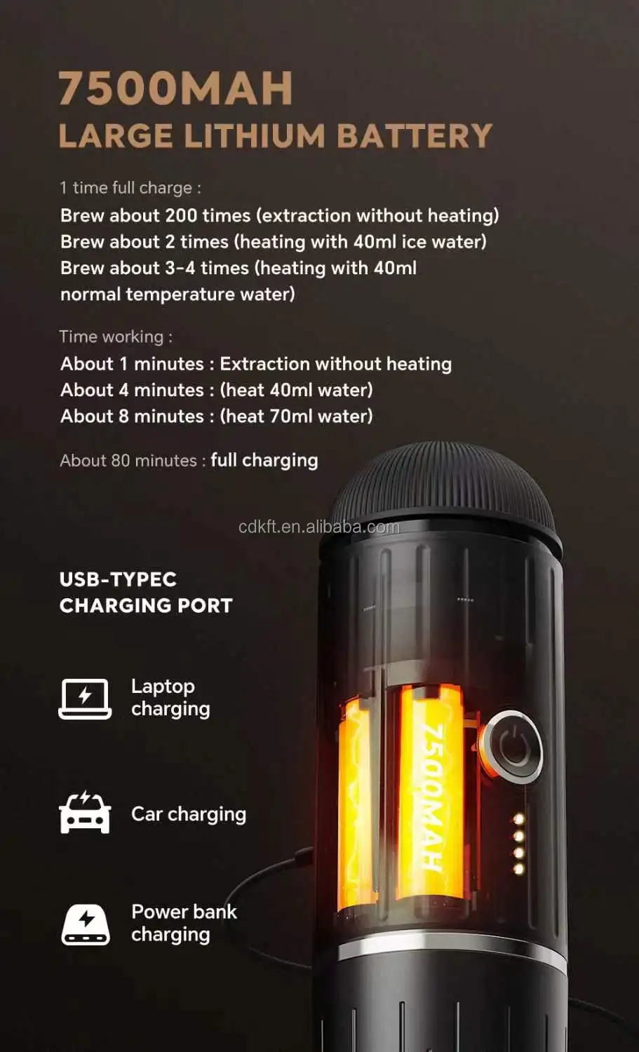4. A fully charged battery can make three cups of espresso with cool water(25℃); or to maker 200 cups of espresso by pressing 5s