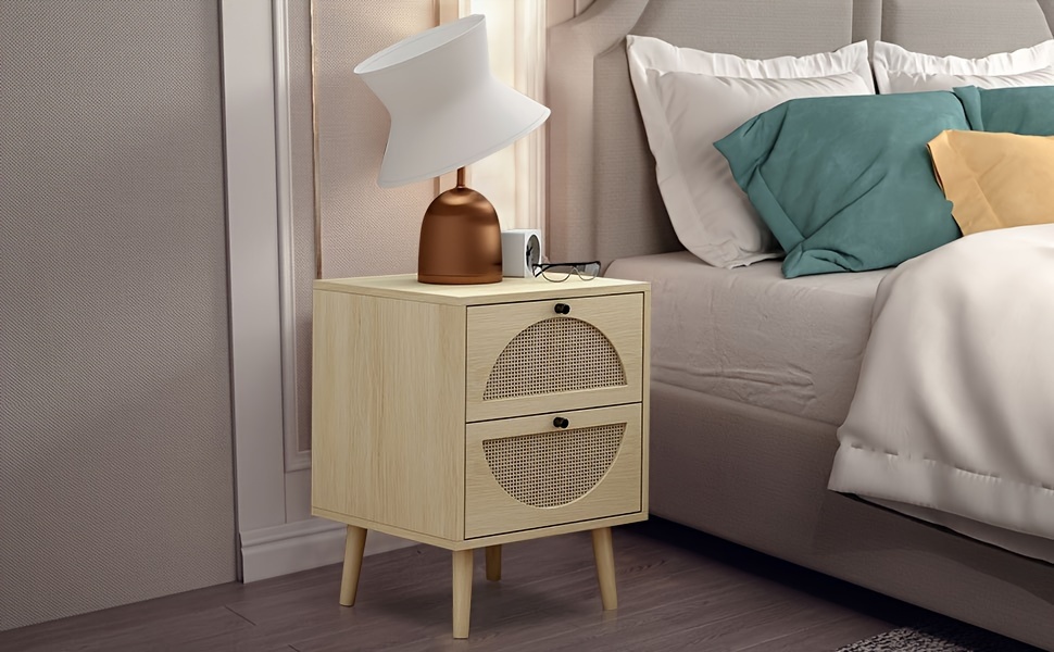 Rattan Drawer: Featuring Two Rattan Storage Drawers Design And Wide Desktop, The Bedside Table Gives You A Lot Of Storage Capacity And Enough Room To Store Books, Desk Lamps, And Snacks.