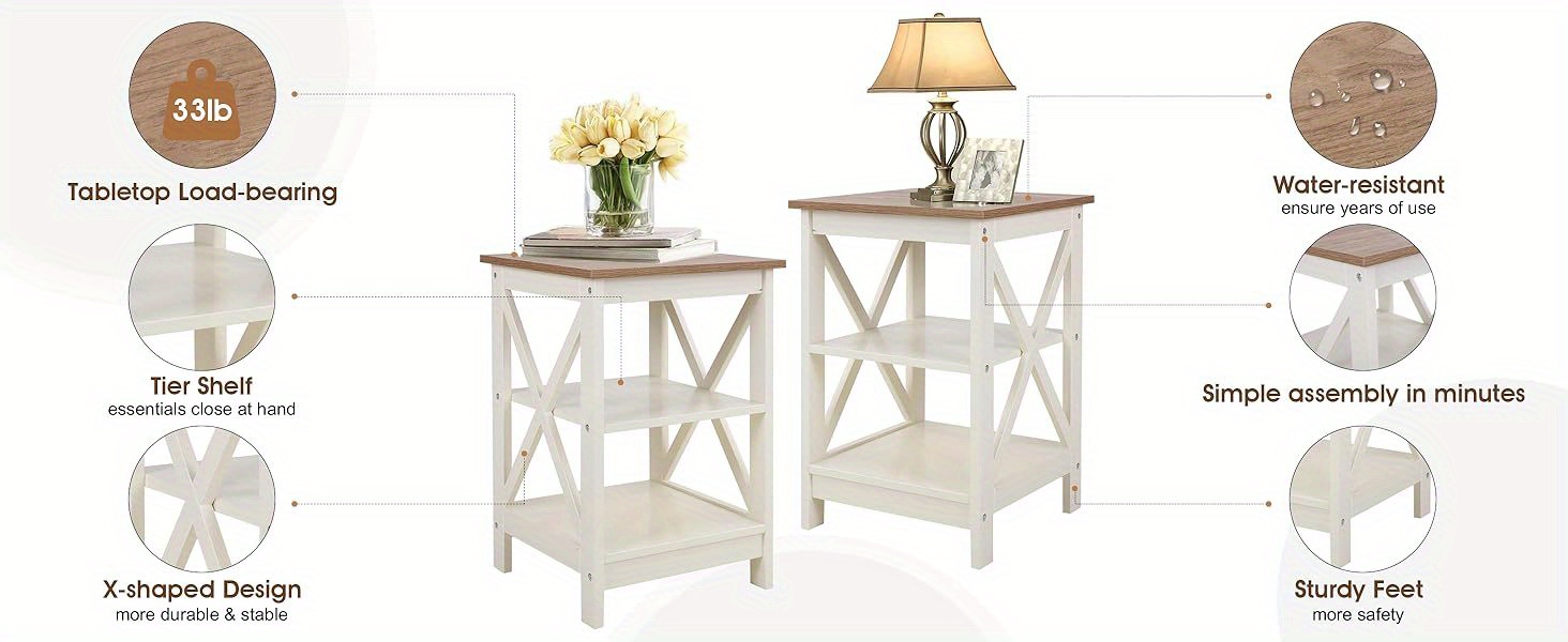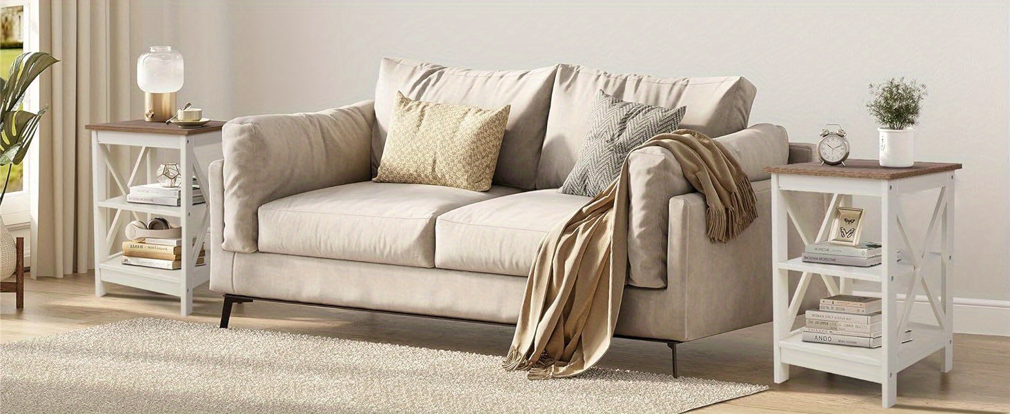 LIFE IMPROVES WITH PHIVILLA 3 TIER SIDE TABLE. This end table can hold an alarm clock, succulent pots, decorative items, books, and more. Its farmhouse color complements any other furniture, enhancing the room's appearance.