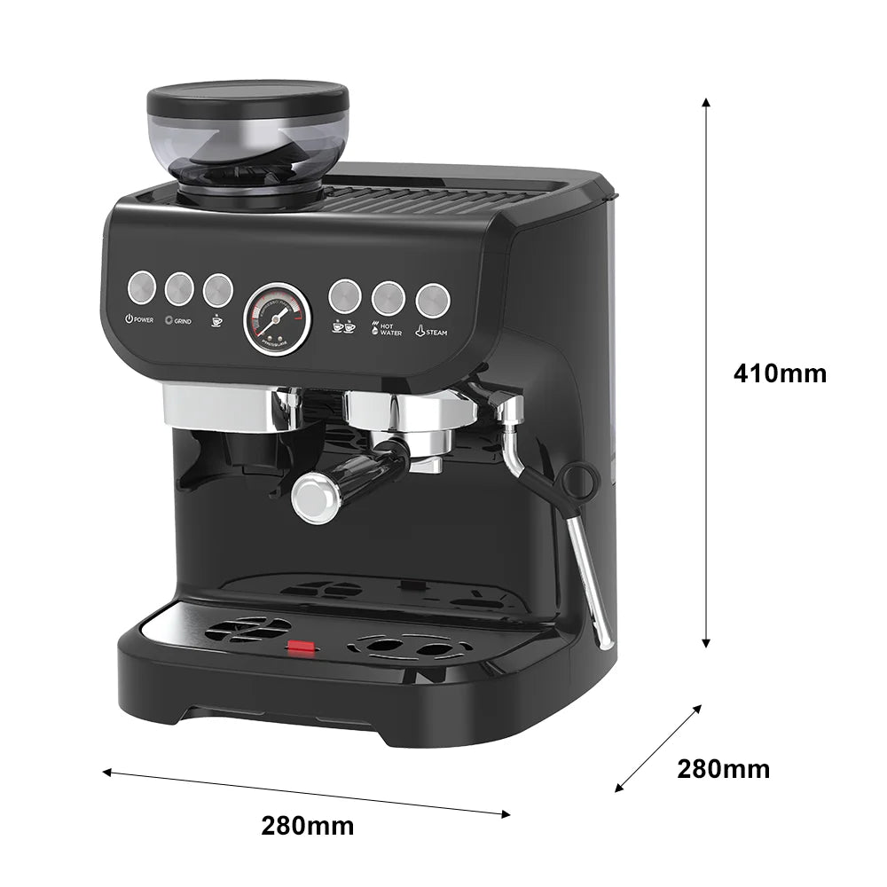 Specification: 1.Power rating: 1450W.220-240V 50/60Hz 2.Water capacity: 2 L. 3.Transparent removable water tank. 4. 15bar Pump 5. Coffee powder holder receive fresh coffee powder from grinding unit 6.Grinding unit can use as bean grinder 7. Auto shut off / energy saving Machine 8. Espresso coffee machine unit built inside, with bean grinder |