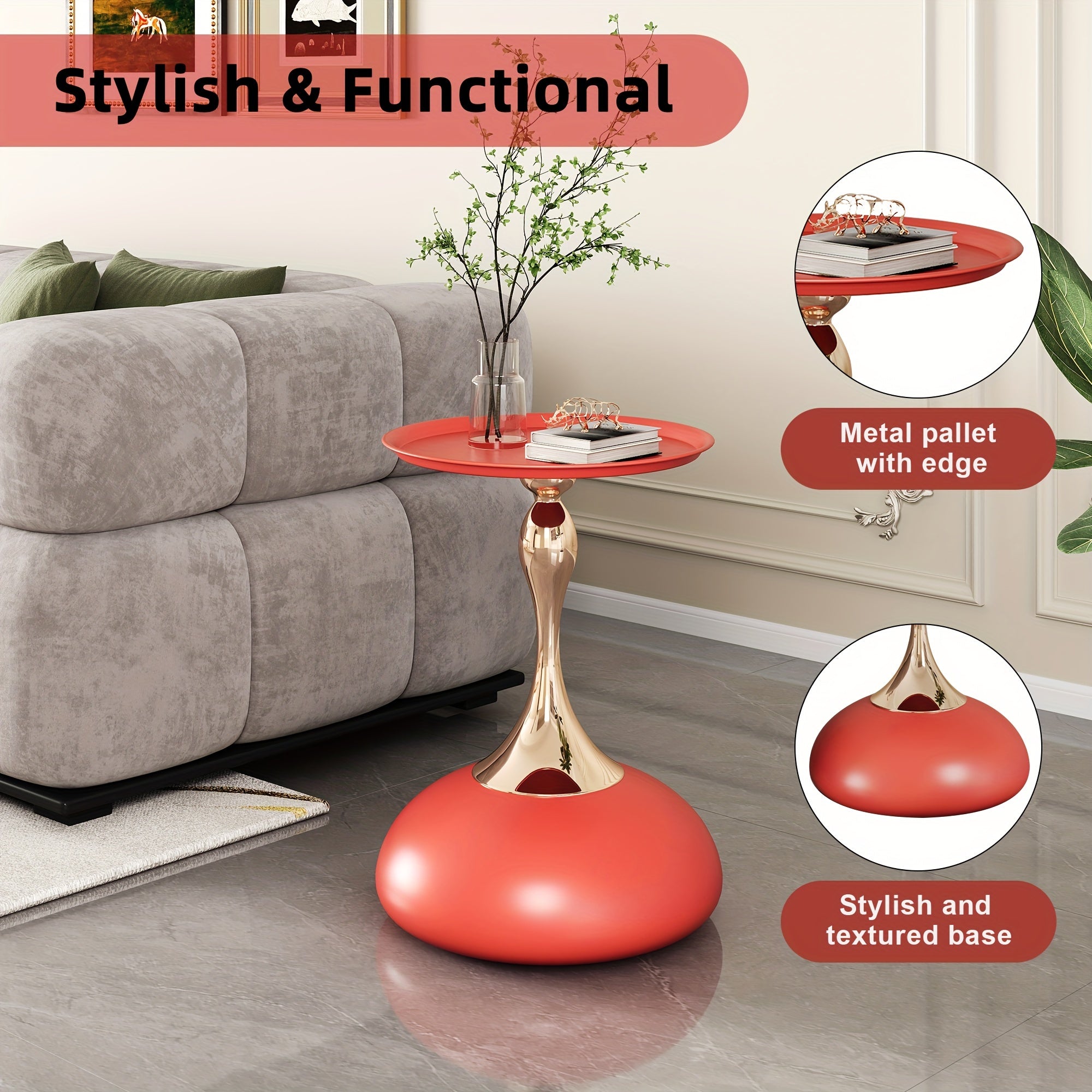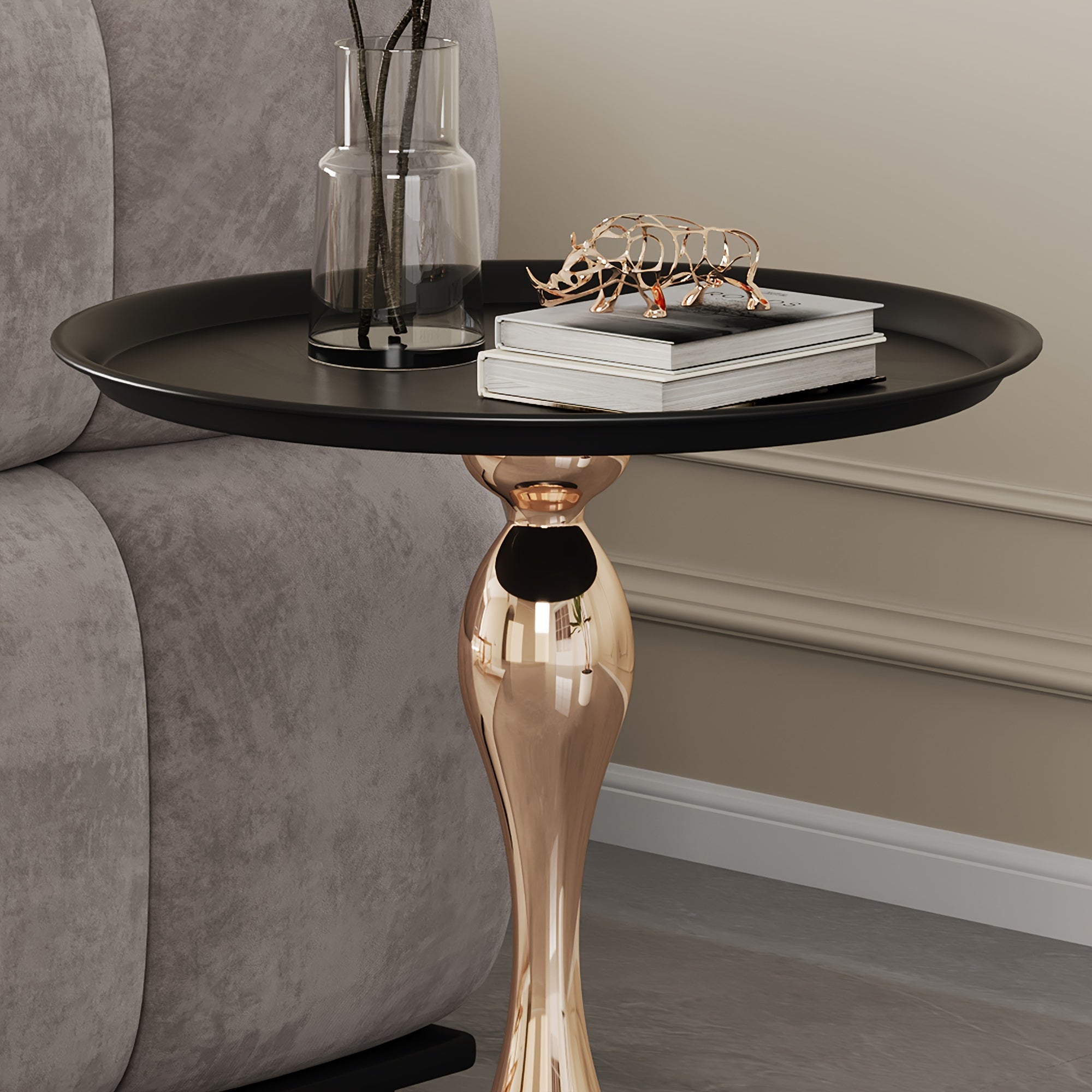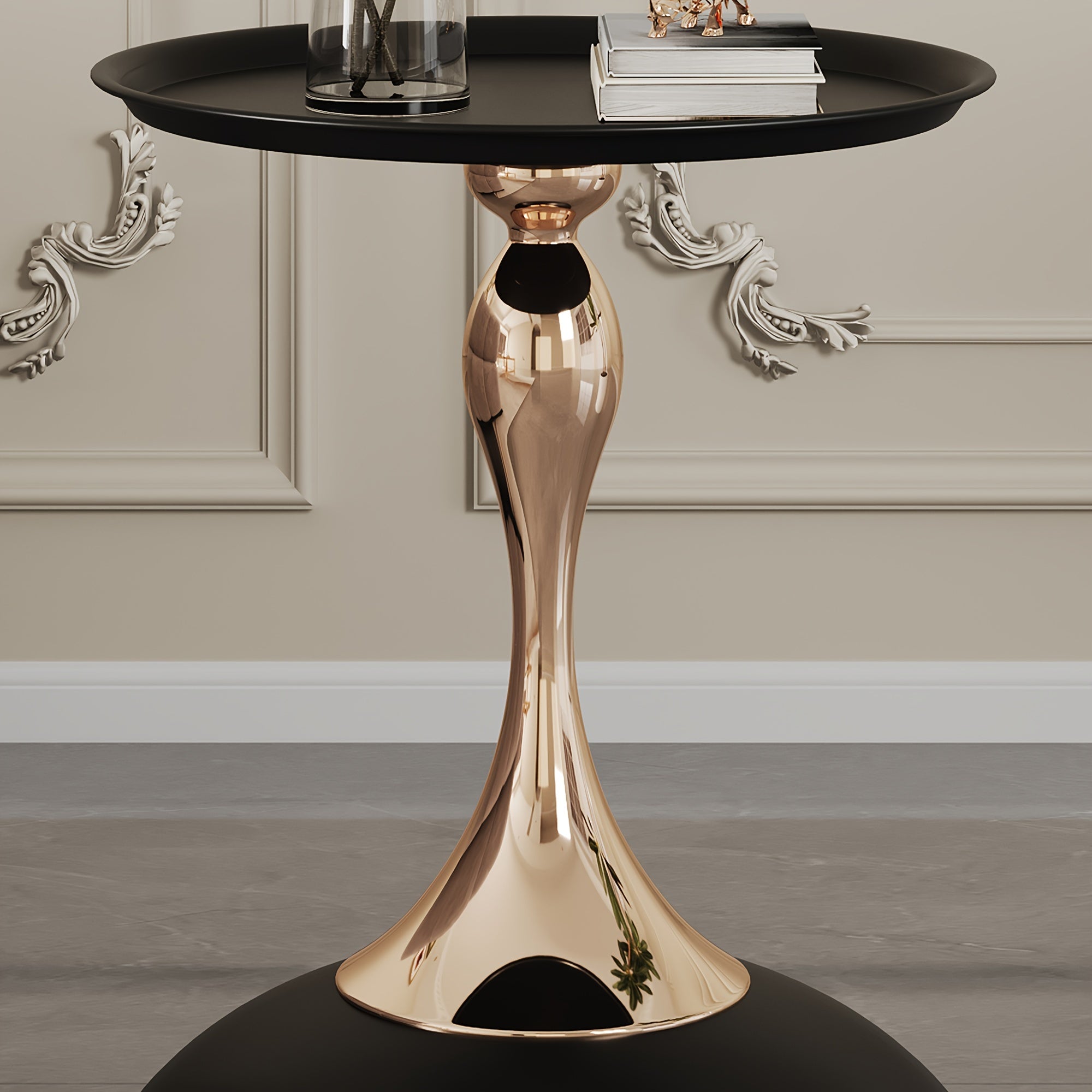 The unique design of the titanium metal small side table breaks tradition, presenting a modern and minimalist visual impact in furniture decoration. Our gold accent table is not only functional but also space-saving, making it ideal for smaller rooms or as a stylish addition to any corner. The pedestal table is elegantly designed like an inverted goblet to enhance the style.