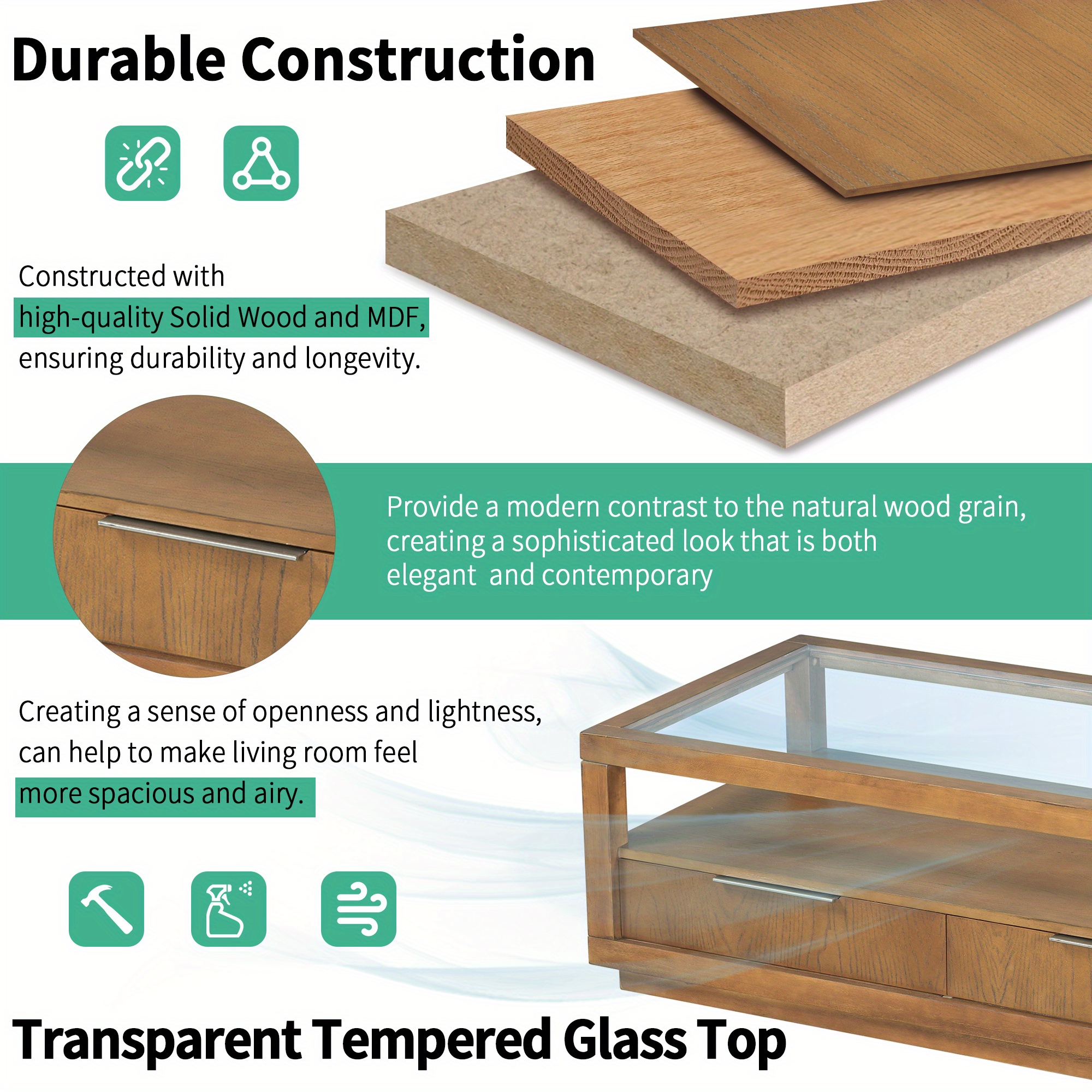 Constructed With High-quality Solid Wood And MDF, Ensuring Durability And Longevity. And It Comes With A Transparent Tempered Glass Top, Creating A Sense Of Openness And Lightness, Can Help To Make Living Room Feel More Spacious And Airy.