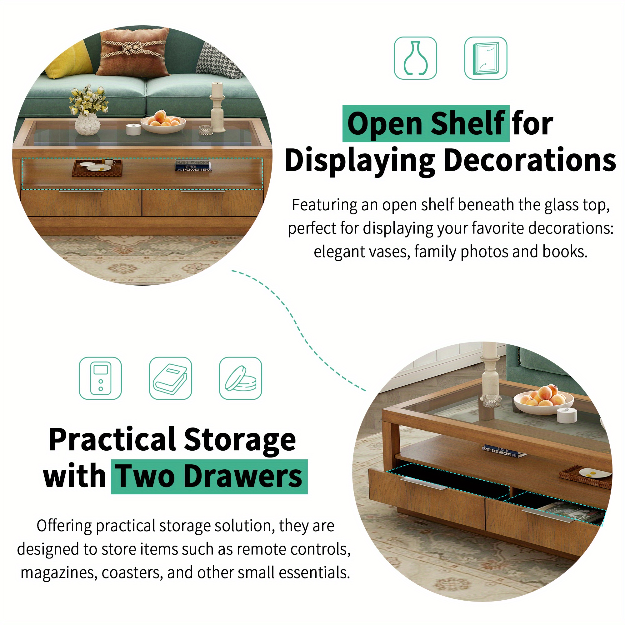 Featuring An Open Shelf Beneath The Glass Top, Perfect For Displaying Your Favorite Decorations: Elegant Vases, Family Photos And Books. And Twp Drawers Are Designed To Store Items Such As Remote Controls, Magazines, Coasters, And Other Small Essentials.