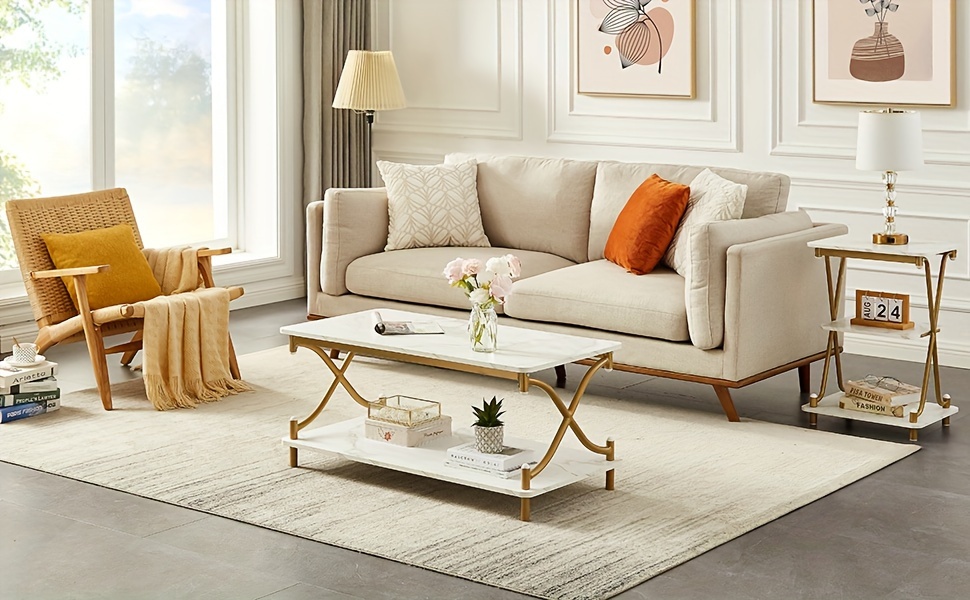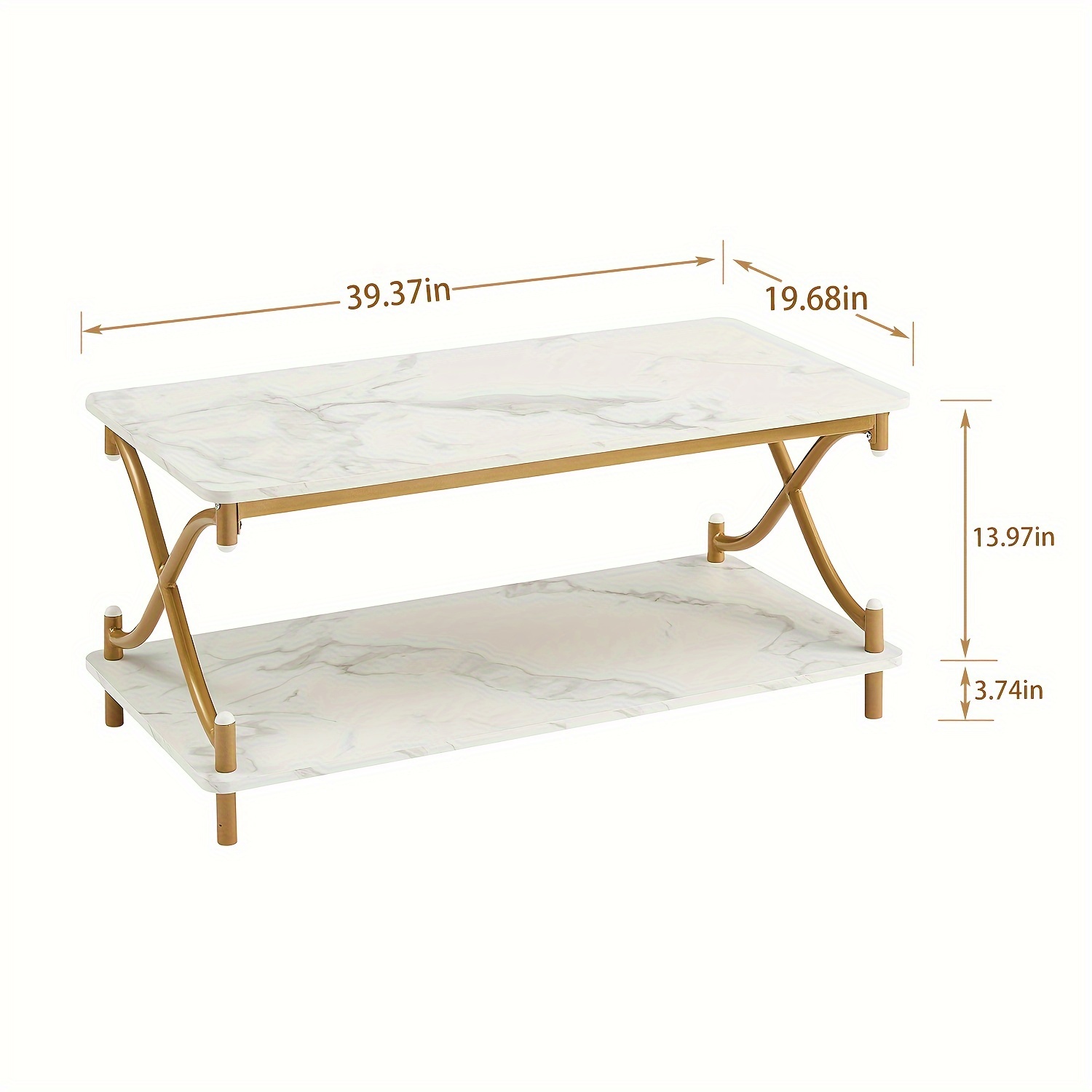 A versatile living room table that can be used as a coffee table for relaxation or as an activity table for spending time with your children at home. Quick and easy assembly, taking only 15-20 minutes, saving you time and space. The contemporary design of this coffee table, featuring a marble surface and a gold metal frame, adds a stylish touch.